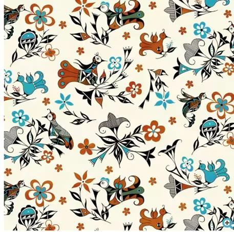 This fabric features a vibrant and artistic design with stylized birds and flowers in a lively pattern. The birds, depicted in shades of blue, turquoise, and red, are intricately detailed with black outlines, giving them a folk-art feel. They are surrounded by an array of flowers in matching colors, creating a cohesive and eye-catching motif. The background is a soft cream, which enhances the vividness of the design elements. This fabric is perfect for creating unique apparel, home decor, or crafting projects that require a touch of whimsy and color.