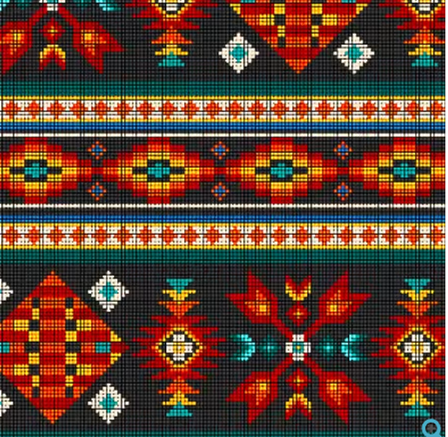"Tucson Collection" by Elizabeth's Studio - This vibrant fabric features a striking design with a black background adorned with intricate patterns in red, orange, yellow, teal, and white. The design showcases a mix of geometric shapes and symbols, including beaded stripes, diamonds, and stylized motifs that create a rich tapestry-like appearance. Ideal for creating eye-catching garments, quilts, or home decor items, this fabric's bold and detailed pattern is sure to make any project stand out.