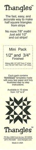 Mini Pack of Thangles contains two sizes. Makes 900- - - 1/2" finished HSTs from 1" strips Makes 750- - - 3/4" finished HSTs from 1.25" strips Complete illustrated instructions included in the package.